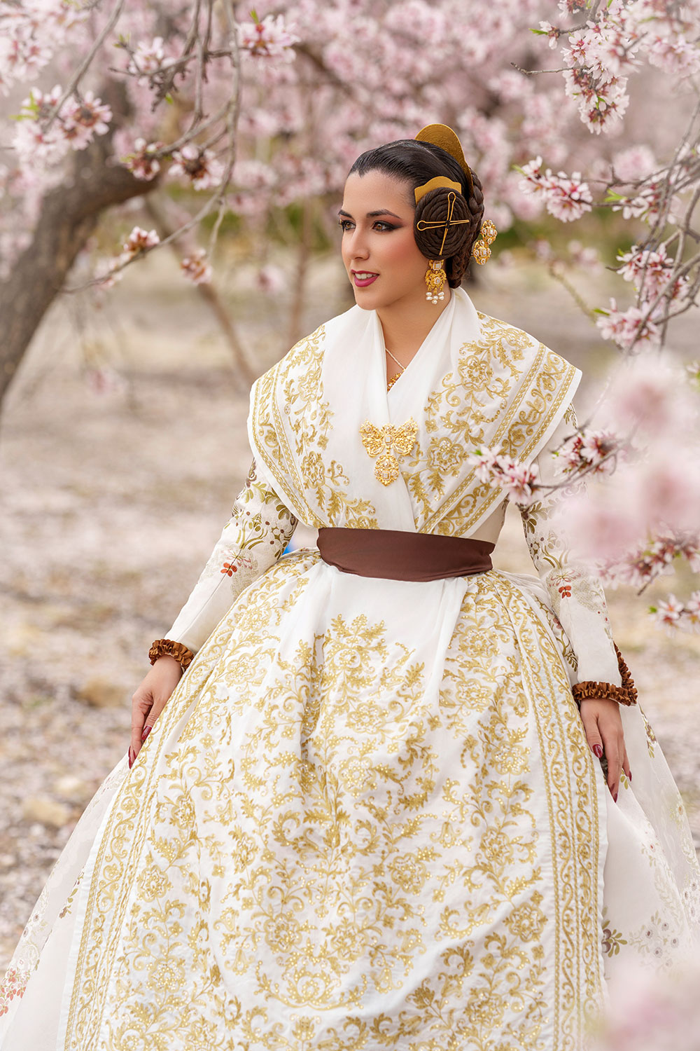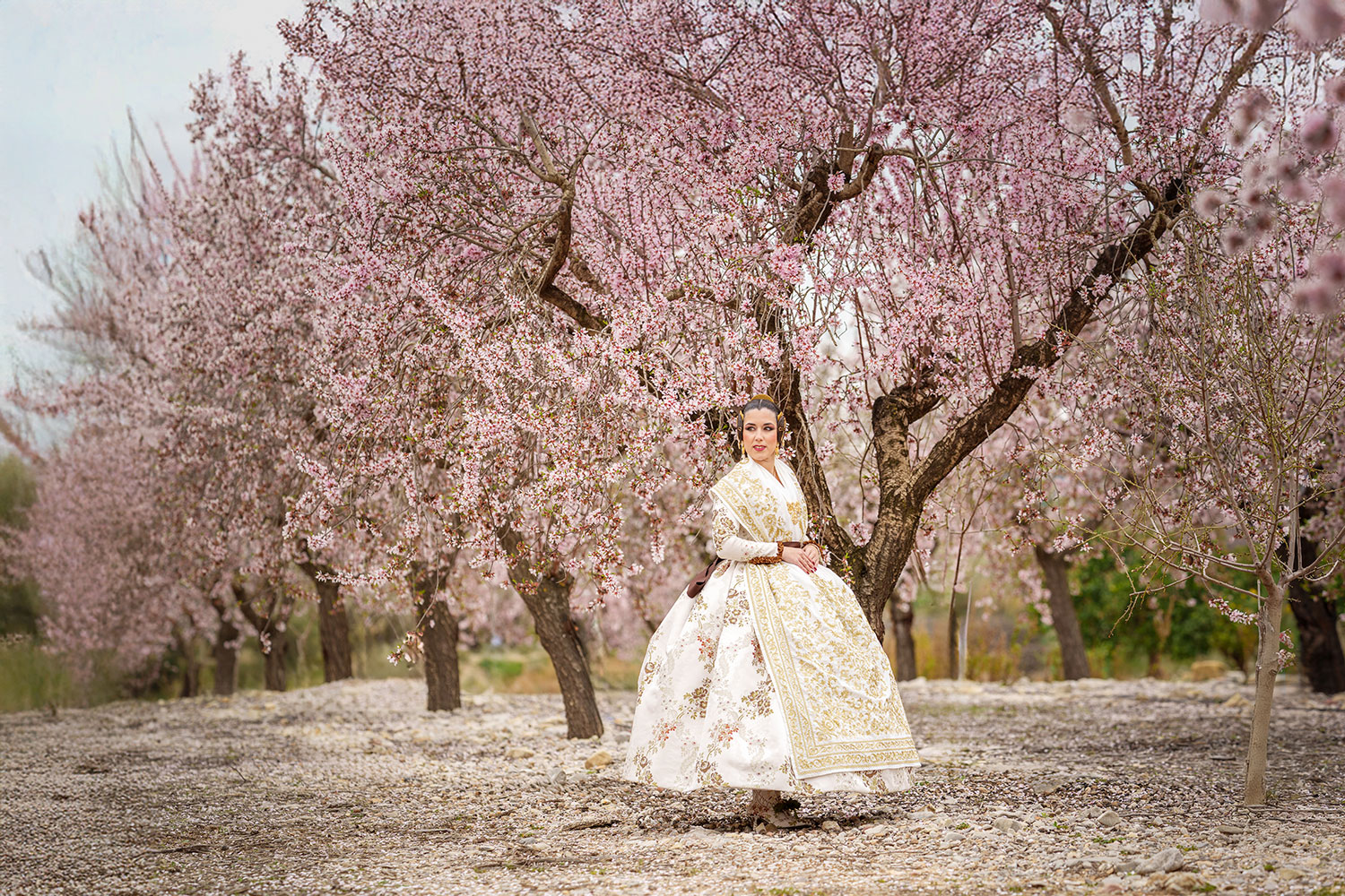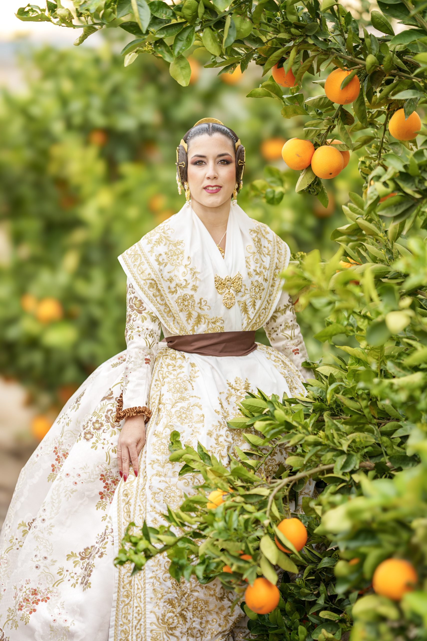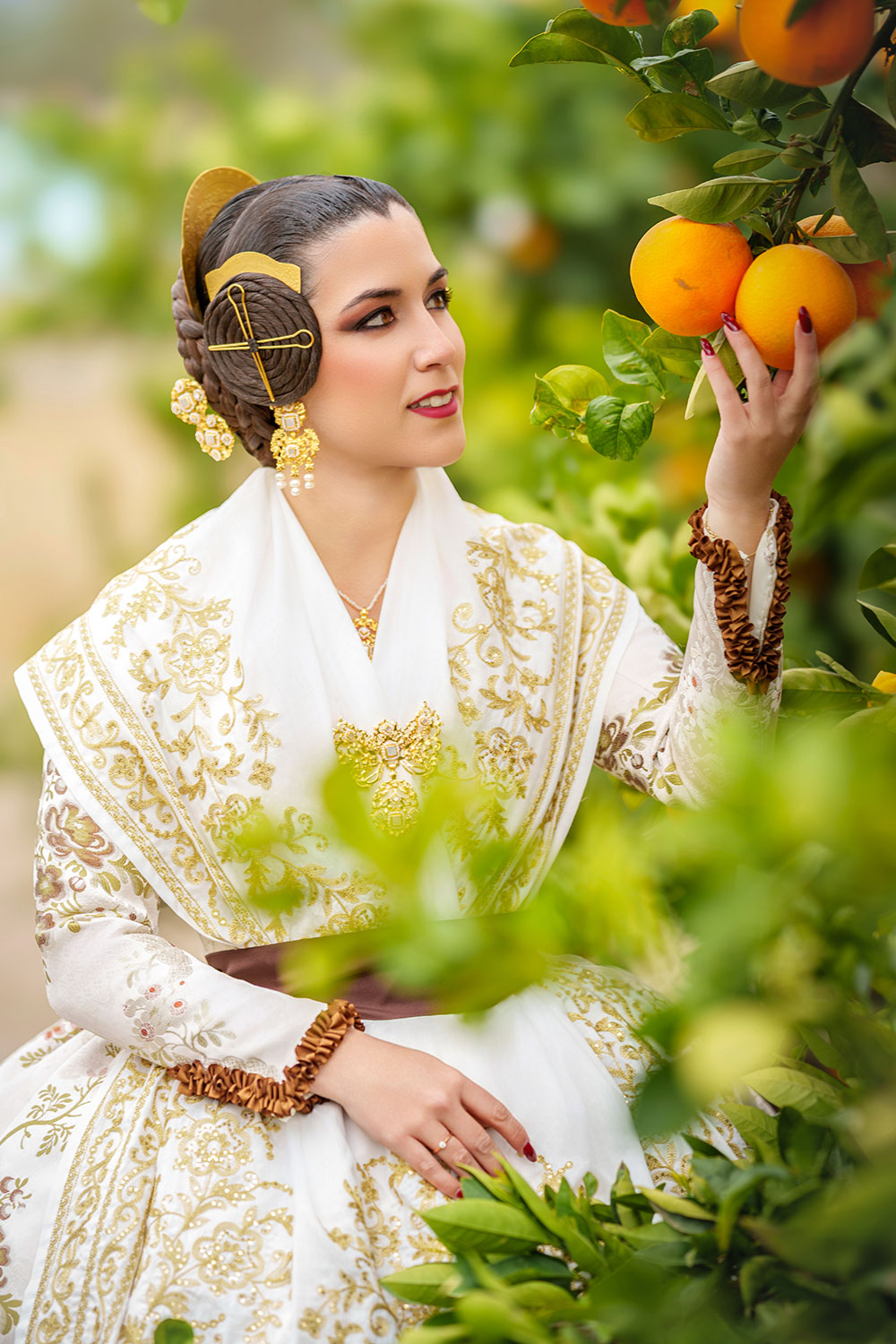 Shauni quería dos reportajes de fallera. El primero en un campo de almendros en flor y el segundo en nuestro estudio en Paterna. Además como no podía faltar en las fotos un campo de naranjas que es uno de los símbolos de los Valencianos con nuestra protagonista.