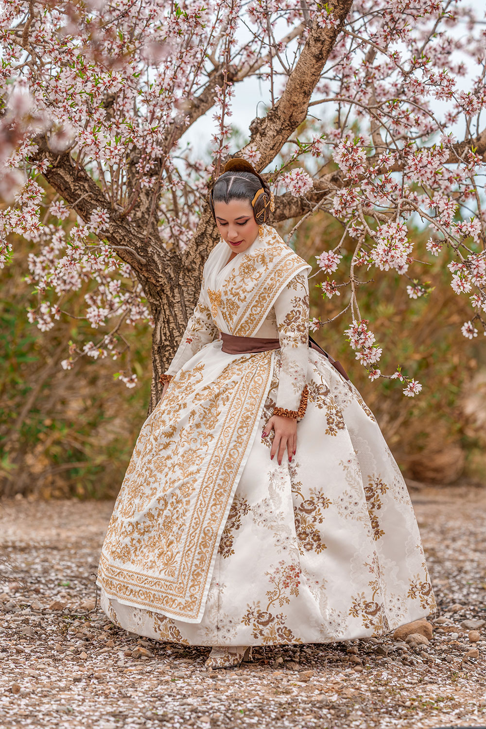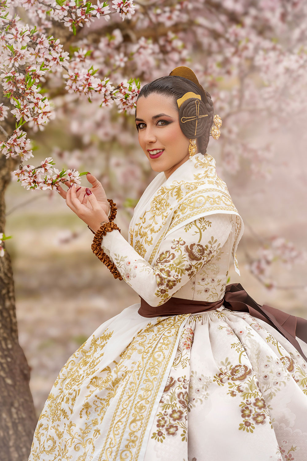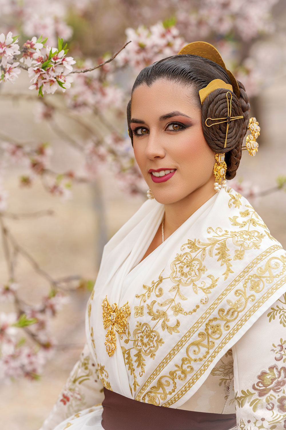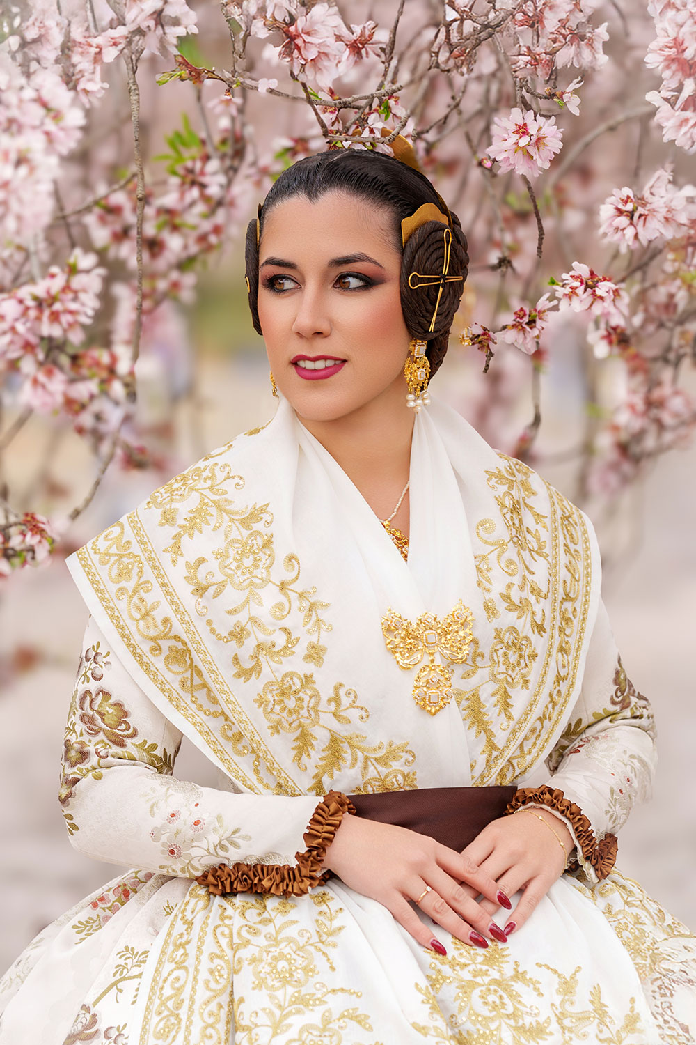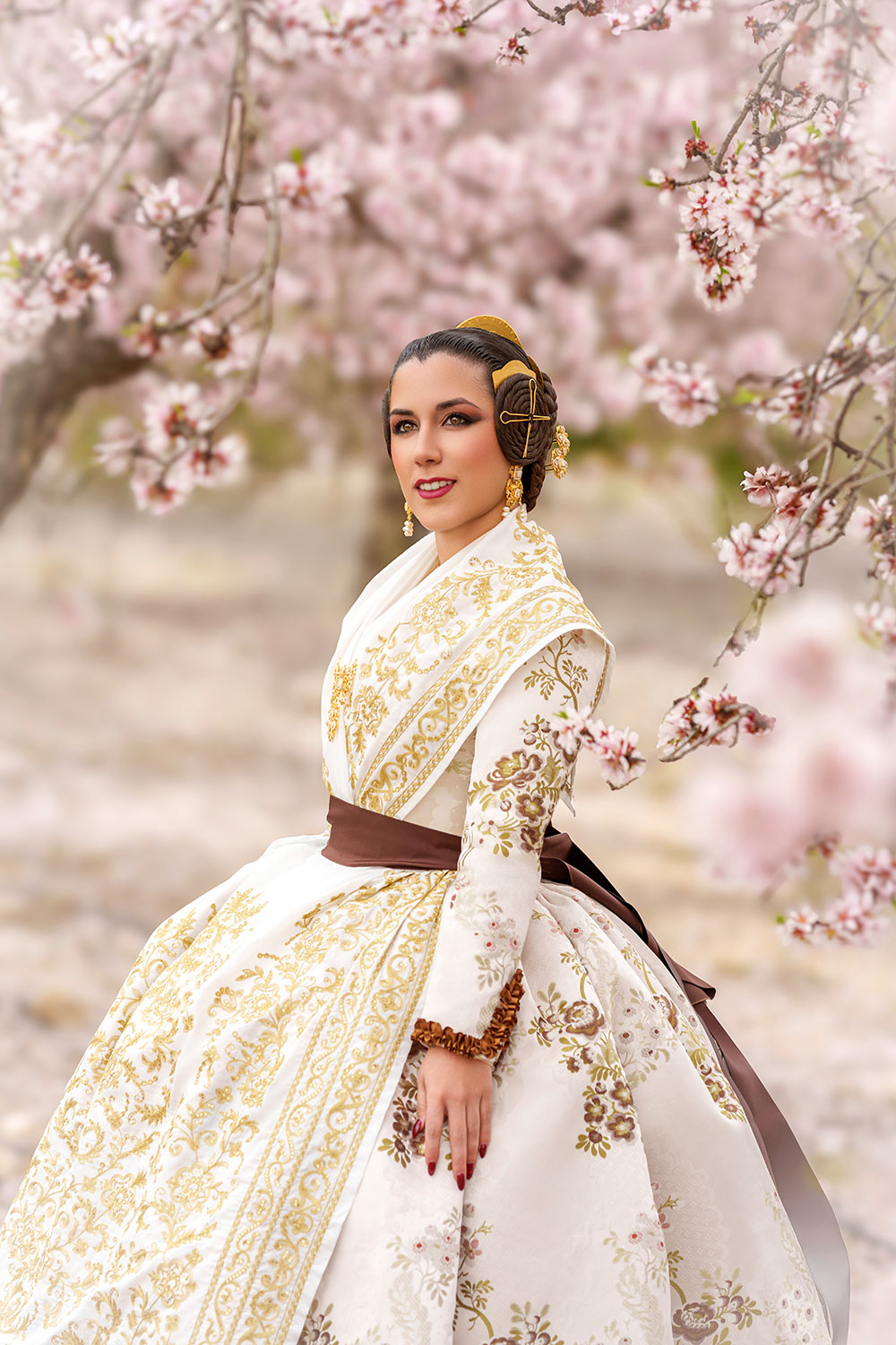 Shauni quería dos reportajes de fallera. El primero en un campo de almendros en flor y el segundo en nuestro estudio en Paterna. Además como no podía faltar en las fotos un campo de naranjas que es uno de los símbolos de los Valencianos con nuestra protagonista.