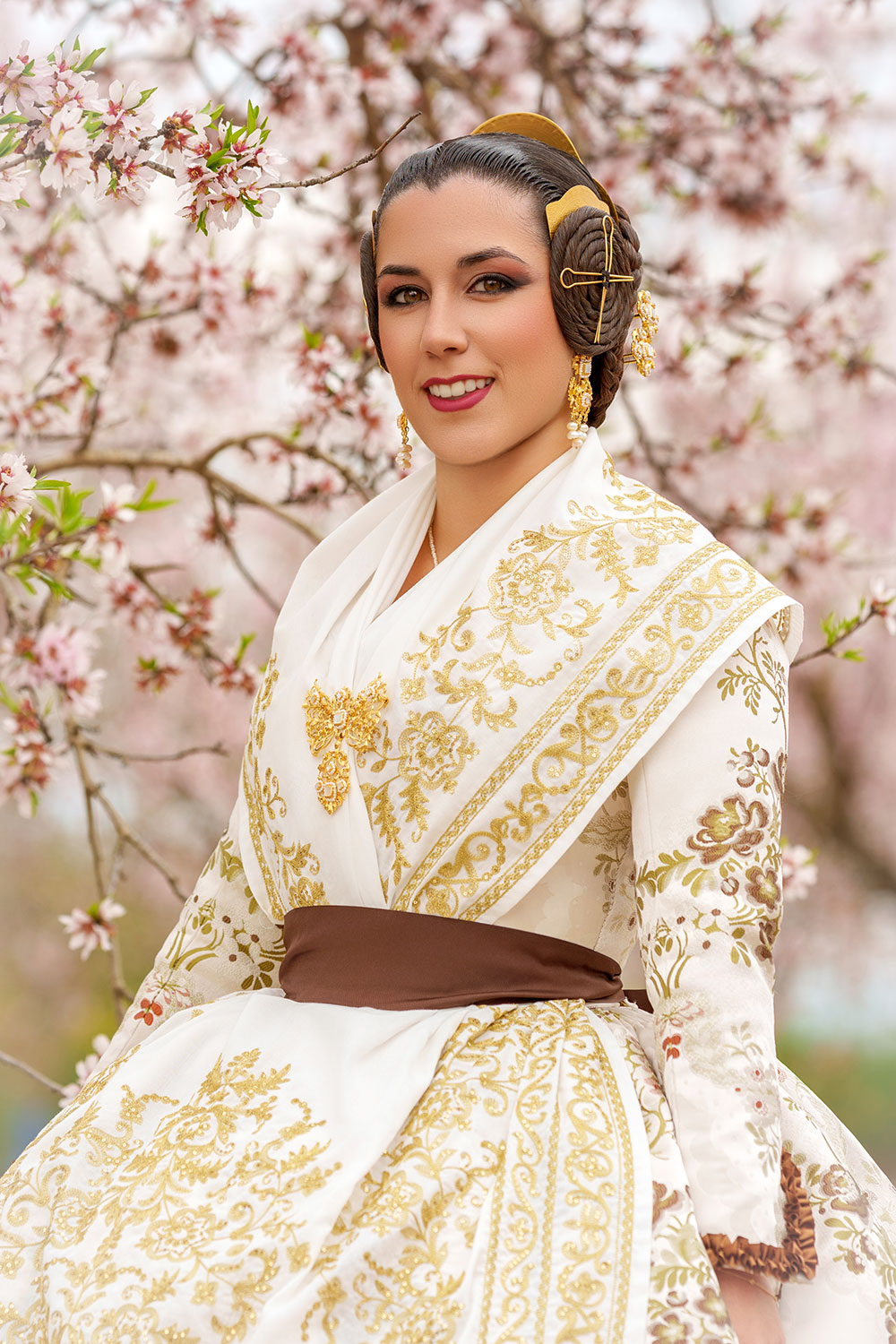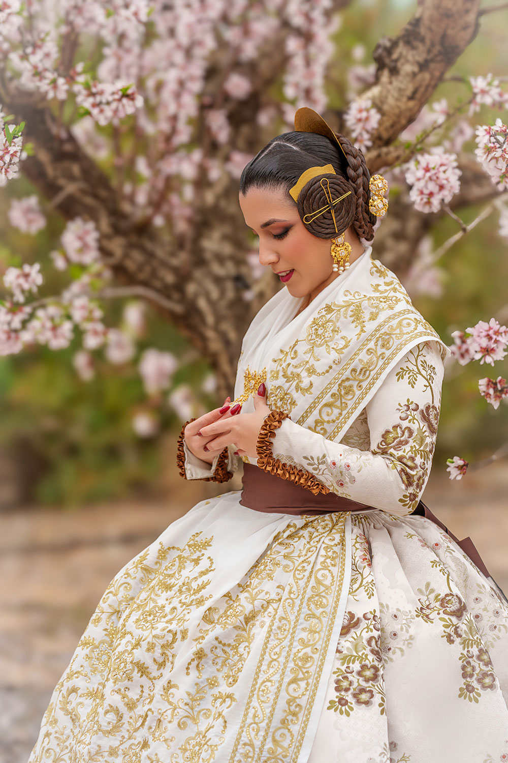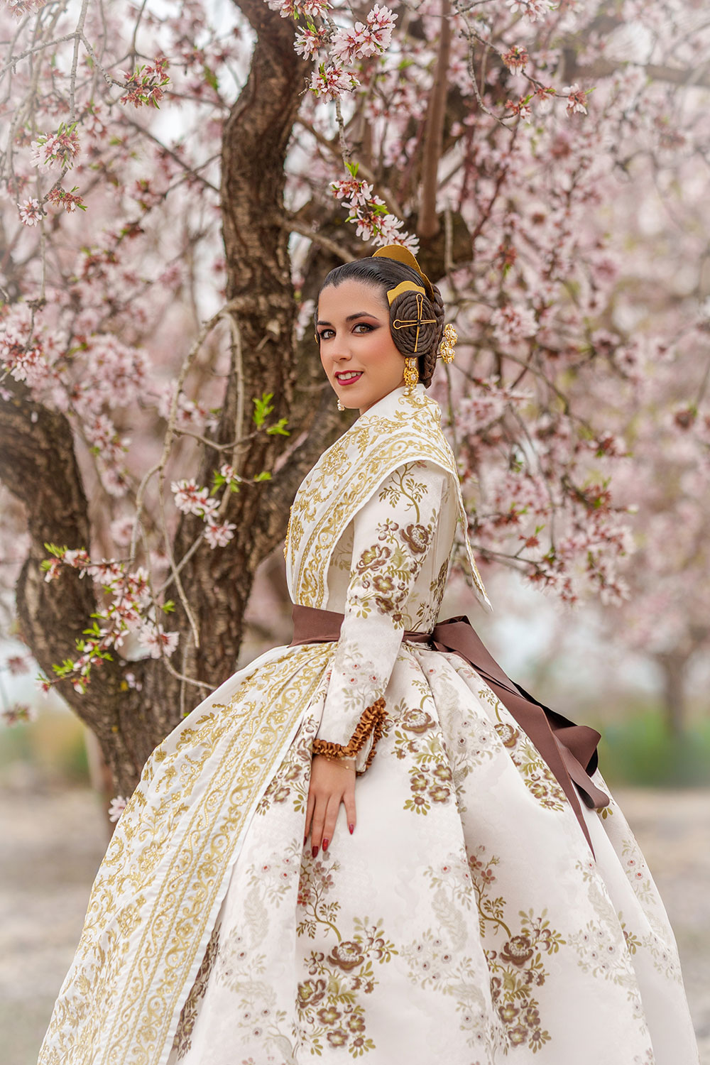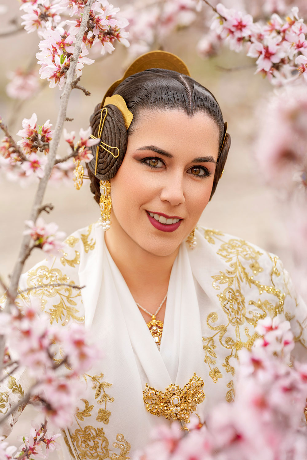 Shauni quería dos reportajes de fallera. El primero en un campo de almendros en flor y el segundo en nuestro estudio en Paterna. Además como no podía faltar en las fotos un campo de naranjas que es uno de los símbolos de los Valencianos con nuestra protagonista.
